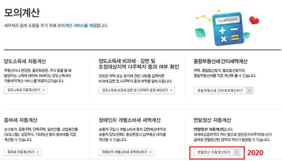 연말정산 자동계산에서 2020년도 눌러주시면 됩니다.